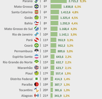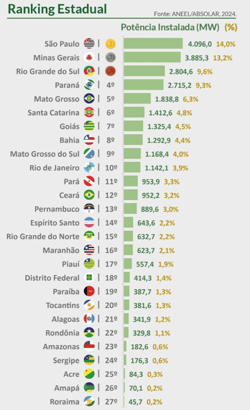 No ranking da Absolar, o estado de São Paulo lidera em número de residências atendidas pela geração própria solar, com cerca de 385,3 mil casas. O Rio Grande do Sul ocupa o segundo lugar, com 303,1 mil residências. Minas Gerais está em terceiro, com 291,8 mil imóveis equipados com placas fotovoltaicas em seus telhados.
